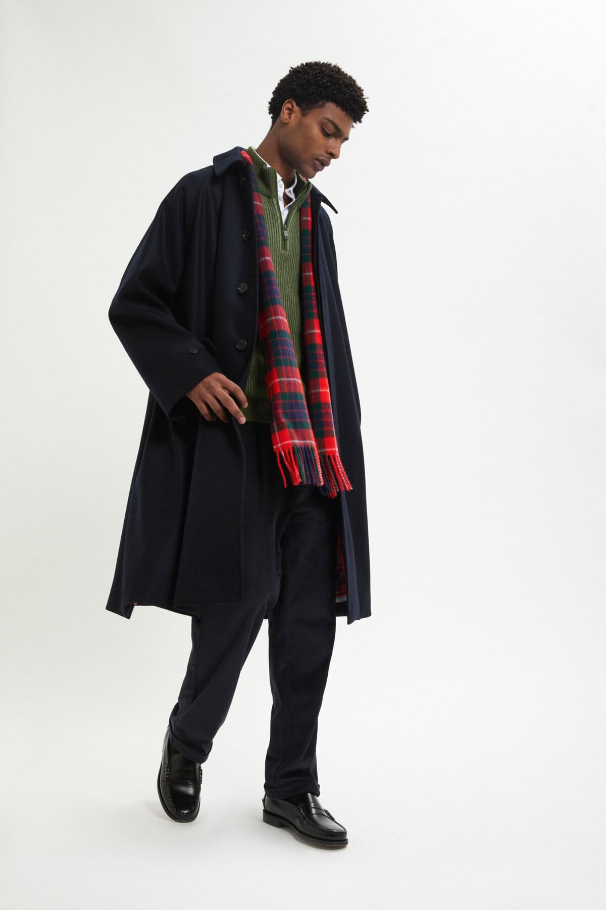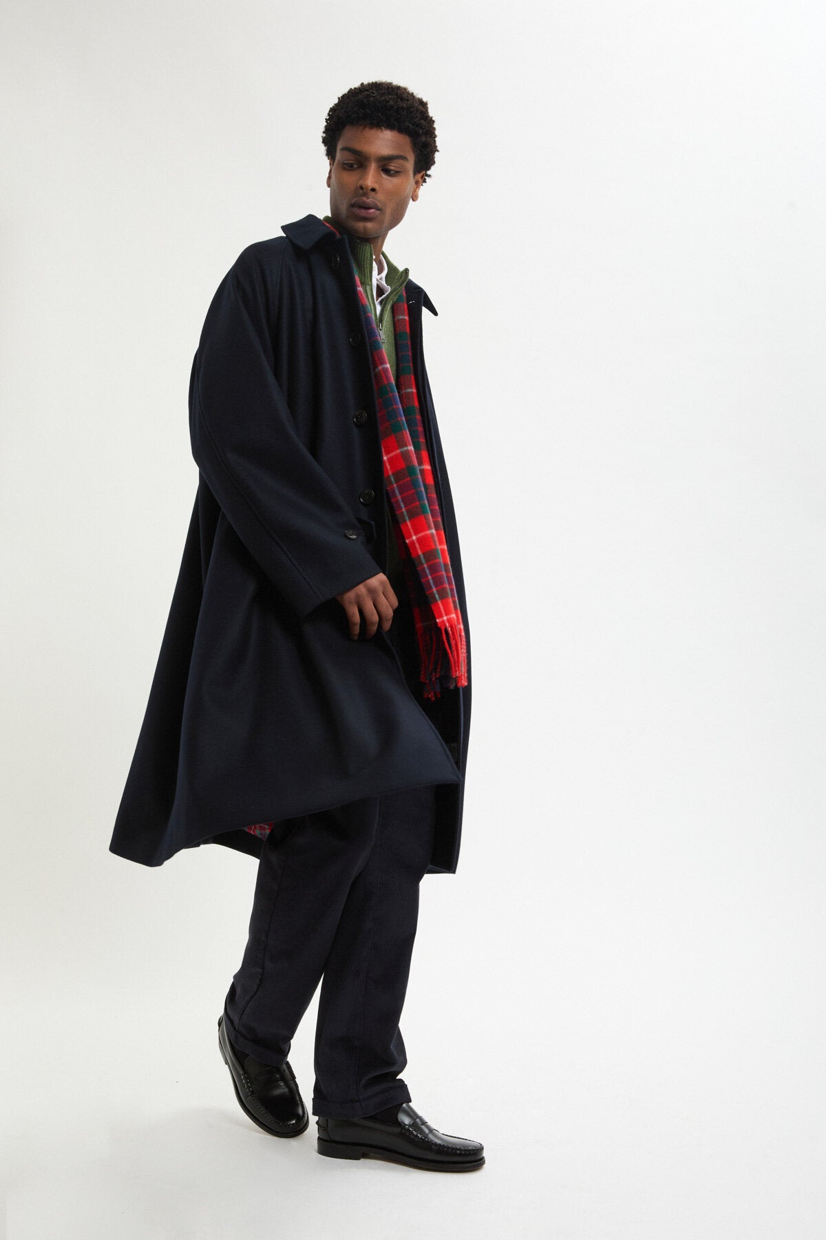 Lang und fließend geschnitten, aus 100 % Wolle gefertigt, begleitet diese Version Sie mit entspannter Verlässlichkeit – genau das, was Sie an kalten Morgen oder bei windigen Spaziergängen zu schätzen wissen. Wenn das Wetter launisch ist, bleibt das Modell souverän und zuverlässig. Im Inneren blitzt dezent das Fraser-Tartan hervor – ein kleiner Charakterzug unter all der ruhigen, souveränen Eleganz. Am Kragen befindet sich zudem eine kleine, raffinierte Knopflasche, bereit dafür, wenn Sie einmal ein zusätzliches Polster für mehr Wärme einfügen möchten.