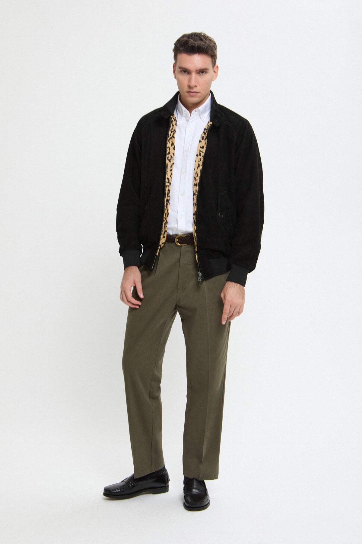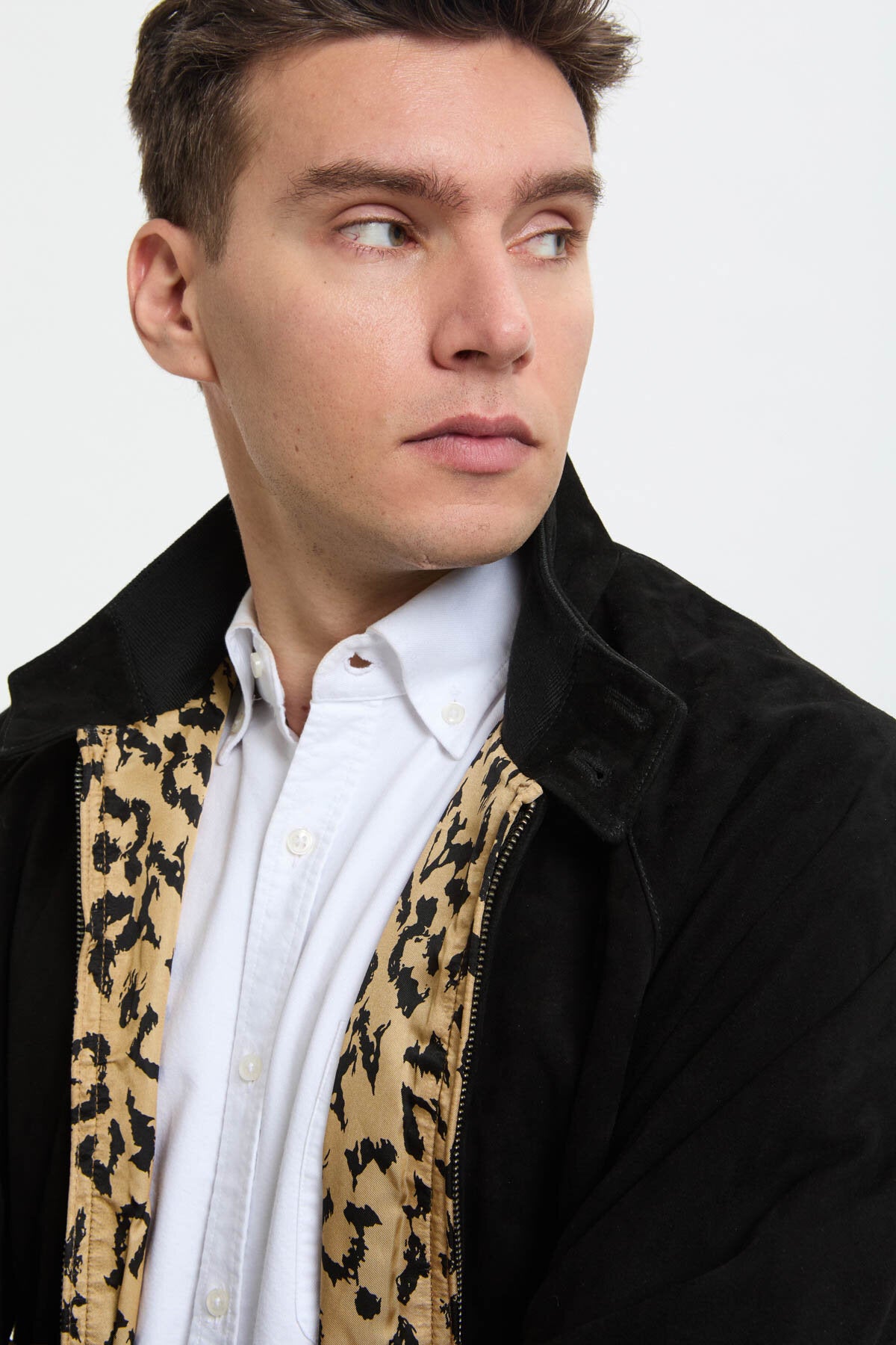 • Il G9 in pelle scamosciata in collaborazione con Wacko Maria fa il suo ritorno in un'accattivante versione con stampa animalier in tre fantastiche varianti cromatiche: Black, Tobacco e Chocolate. L’esterno della giacca è realizzato in pelle scamosciata premium di Baracuta, mentre l'iconica fodera con stampa leopardata all'interno conferisce al modello il tocco inconfondibile di Wacko Maria. Completa il tutto il discreto dettaglio con passante a catena in metallo. Il capospalla presenta inoltre un design moderno e un taglio più ampio, che donano al modello un look versatile e unisex.