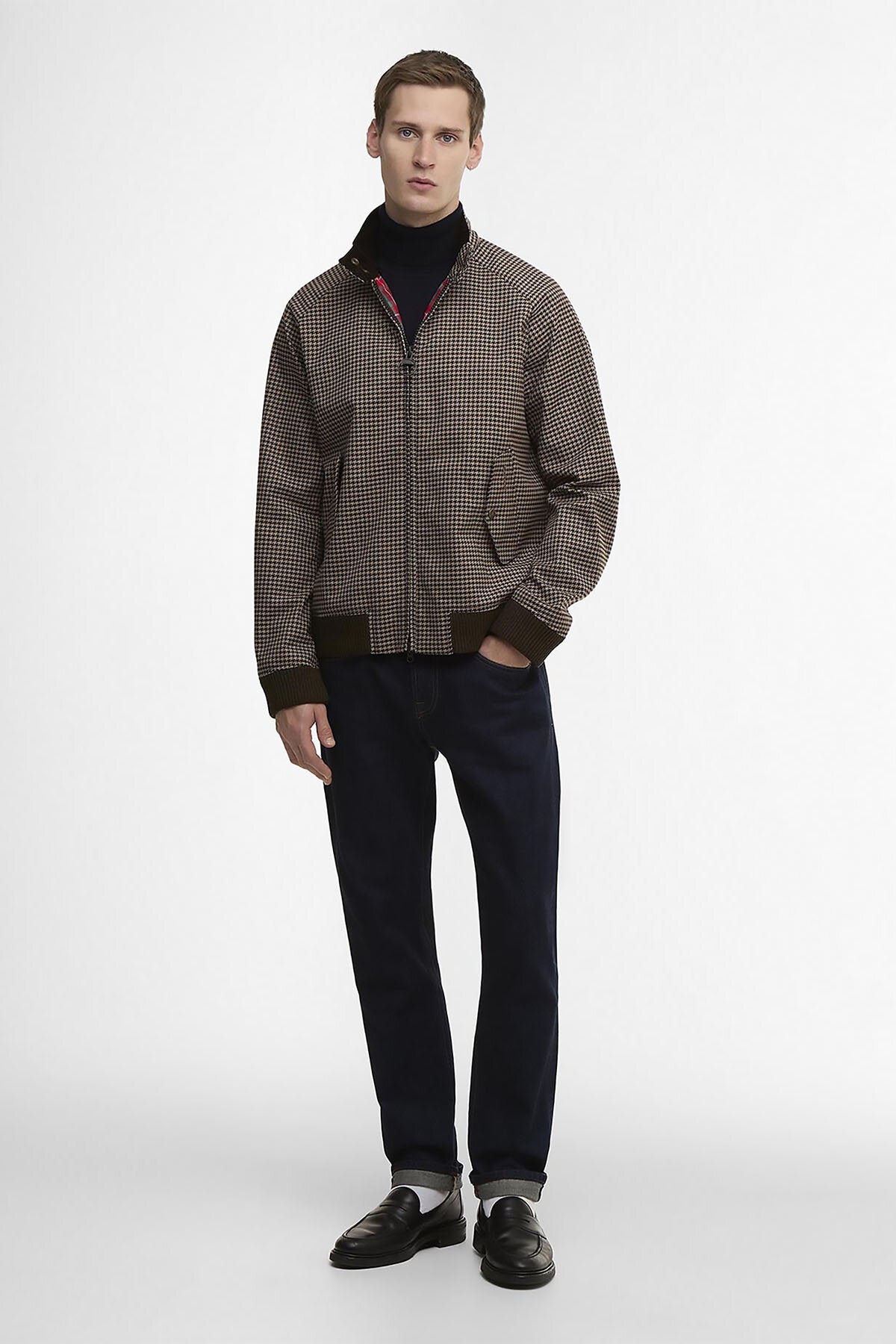 • • Same as the badged Porton jacket, but in a brown houndstooth colourway.