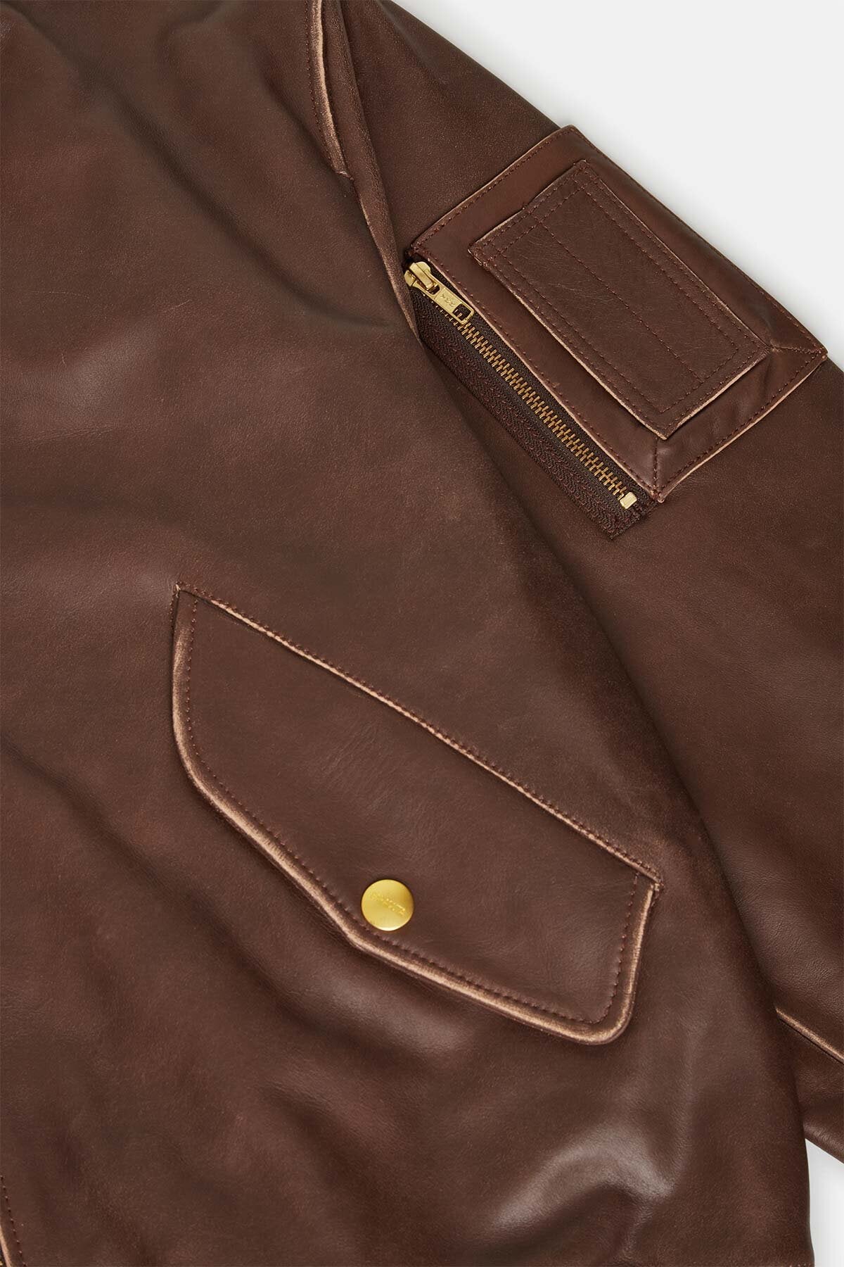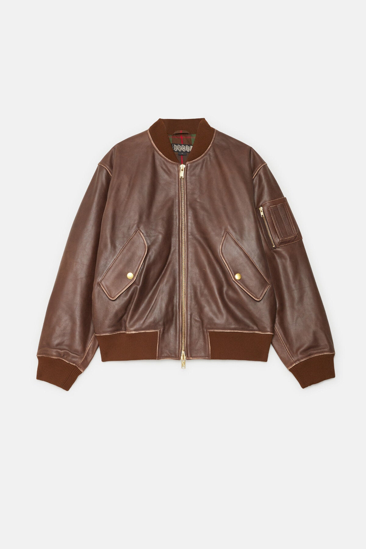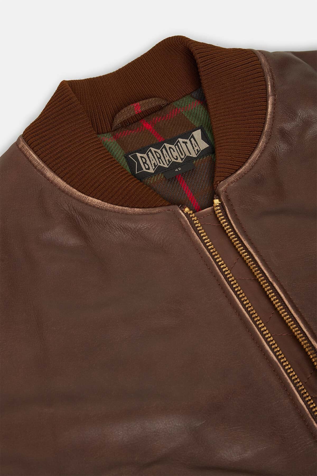 • The Leather Flight Jacket channels classic aviation heritage through a refined Baracuta lens. Crafted from premium cow leather, it features a bold oversized fit and is fully lined in the brand’s signature Fraser Tartan for a distinct touch of British flair. Ribbed trims at the collar, cuffs, and waistband offer structure and comfort, while the two-way logoed zip and snap-button diagonal pockets add both functionality and attitude. A timeless outerwear piece built to last.